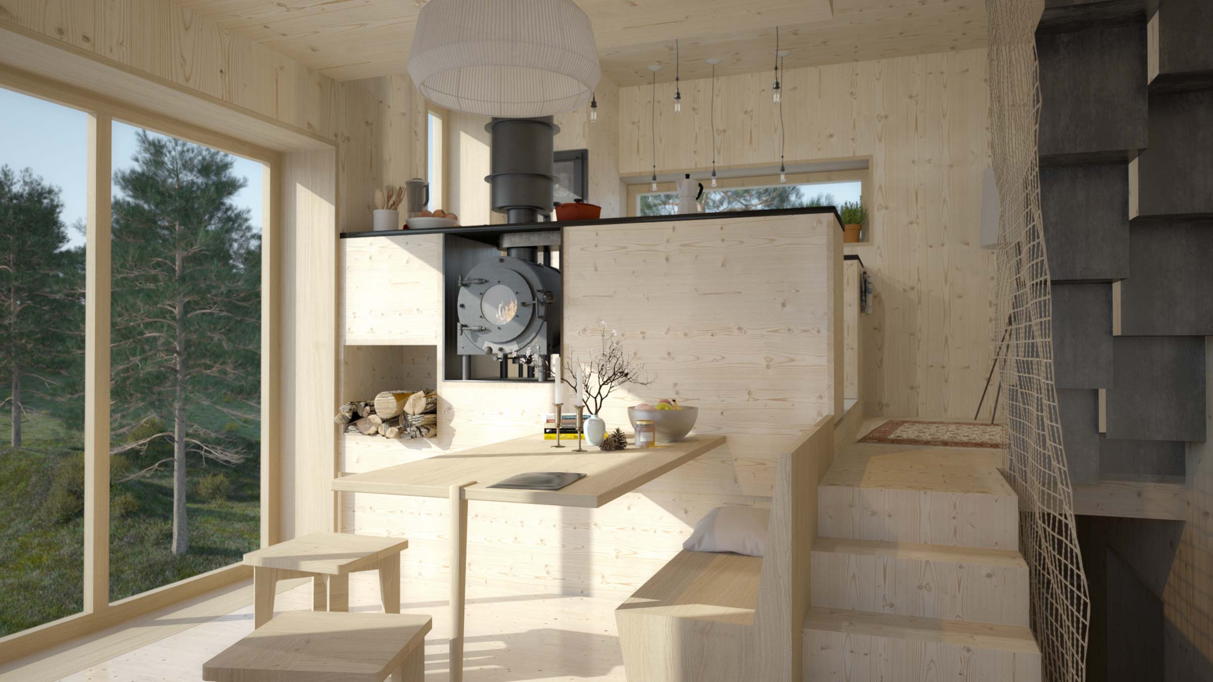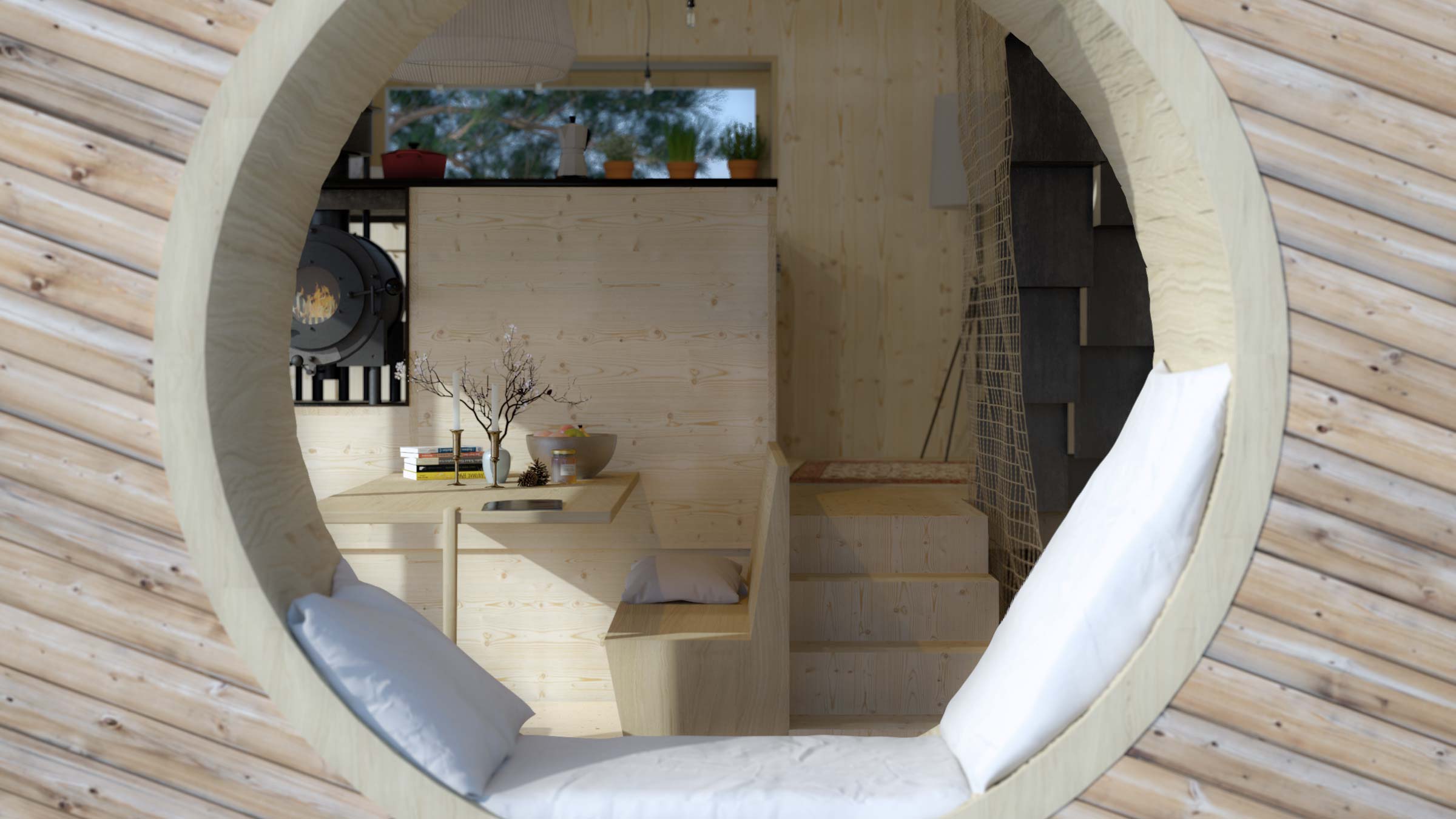 Das 160cm grosse Rundfenster mit einem 60cm tiefen Fensterbrett, dient als Liege zum entspannen und Buch lesen. Zum Tisch gehören die 2er-Sitzbank sowie zwei Hocker und bieten für 4 Personen Sitzmöglichkeiten. Die Tischplattengrösse lässt sich variieren indem sie, unter der Küchenstufe liegend, weiter heraus- oder hineingezogen werden kann. Weiter lässt sich die Tischplatte frei herausnehmen und mit den Hockern, sowie der Sitzbank zu einem temporären Gästebett umwandeln. Der Holzofen als Feuerstelle sorgt für eine wohlige Wärme. Ein Panoramafenster sorgt südseitig für genügend Licht und Aussicht.