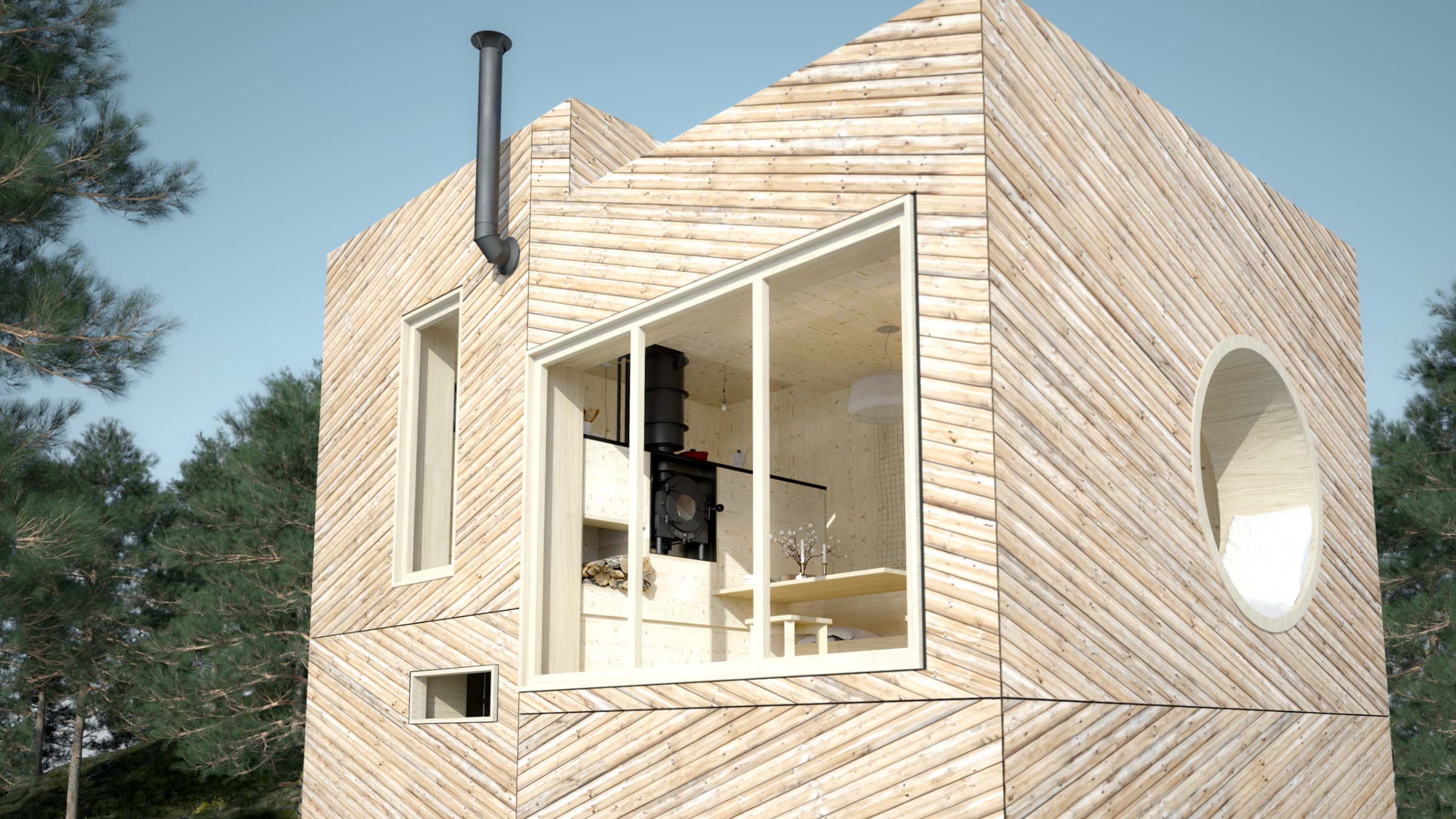 Das 160cm grosse Rundfenster mit einem 60cm tiefen Fensterbrett, dient als Liege zum entspannen und Buch lesen. Zum Tisch gehören die 2er-Sitzbank sowie zwei Hocker und bieten für 4 Personen Sitzmöglichkeiten. Die Tischplattengrösse lässt sich variieren indem sie, unter der Küchenstufe liegend, weiter heraus- oder hineingezogen werden kann. Weiter lässt sich die Tischplatte frei herausnehmen und mit den Hockern, sowie der Sitzbank zu einem temporären Gästebett umwandeln. Der Holzofen als Feuerstelle sorgt für eine wohlige Wärme. Ein Panoramafenster sorgt südseitig für genügend Licht und Aussicht.