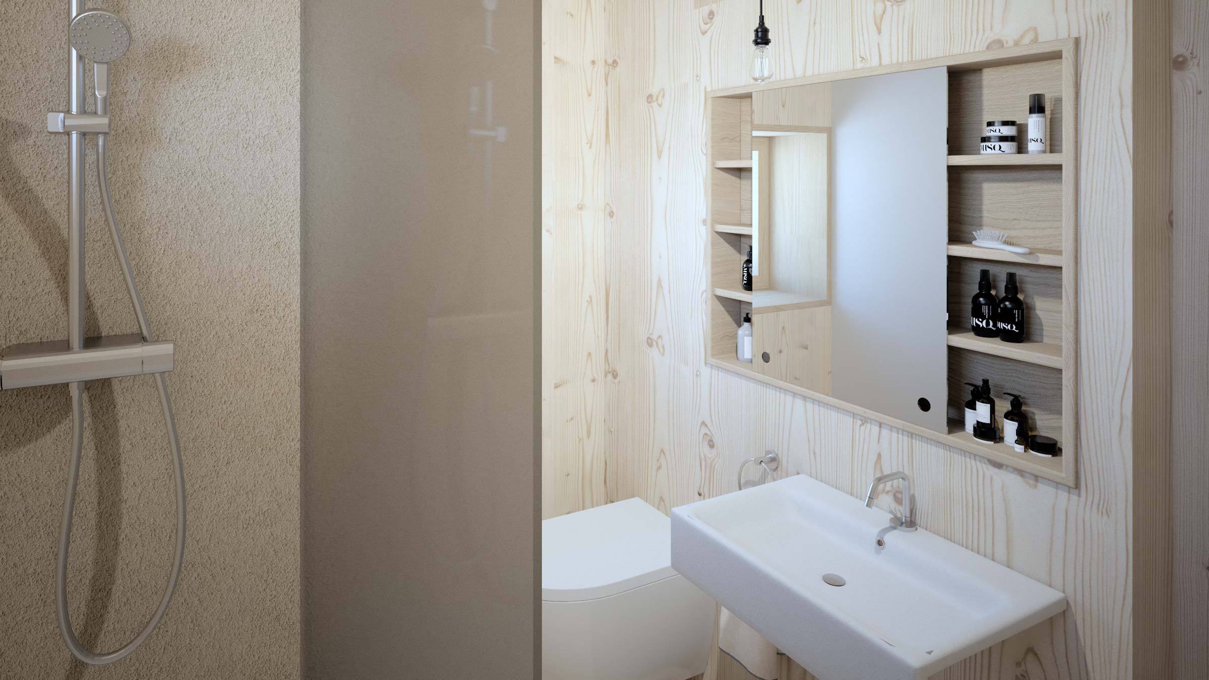 In diesem Modul befindet sich die Eingangstüre. Dieses Modul beinhaltet fast alle wasserführenden Elemente des Hauses. Dusche, Lavabo, WC, Waschmaschine und ein Wärmetauscher für die Heizung sind hier verbaut. Versteckt in der Trennwand zwischen Eingang und Bad befinden sich alle Leitungen zur Küche. Ein kleiner Spiegelwandschrank dient zum Aufbewahren der Pflegeutensilien. Die Schiebtüre zum Bad ist ebenfalls in der Trennwand untergebracht. Im hinteren Teil der Garderobe findet sich in diesem Modul noch Stauraum zur Aufbewahrung von Putzutensilien und Staubsauger.