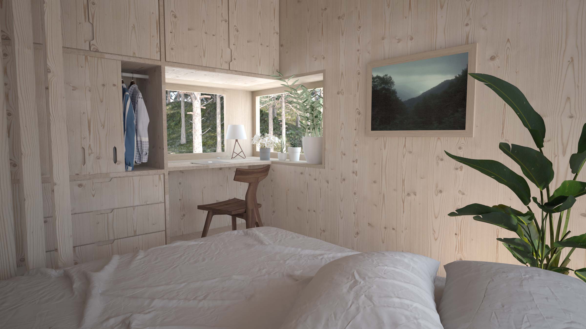 Im Schlafzimmer findet ein Doppelbett mit zwei Storageboxen nebeneinanderliegend Platz. Über dem Bett befindet sich nochmals 3m3 Stauraum für beispielsweise saisonale Bekleidung oder Sportequipment. Das Wandmöbel ist multifunktional und dient als Wandschrank für Kleider, als Büroarbeitsplatz und als Treppe. Eine Fenstertüre ermöglicht den bodenebenen Zugang in den Garten. Eine kleine Frischluftöffnung auf der Nordseite des Hauses versorgt hier das Haus mit Frischluft. Inspiriert von japanischen Atelierplätzen steht der kleine Bürotisch an einem Eckfenster mit Blick nach draussen.